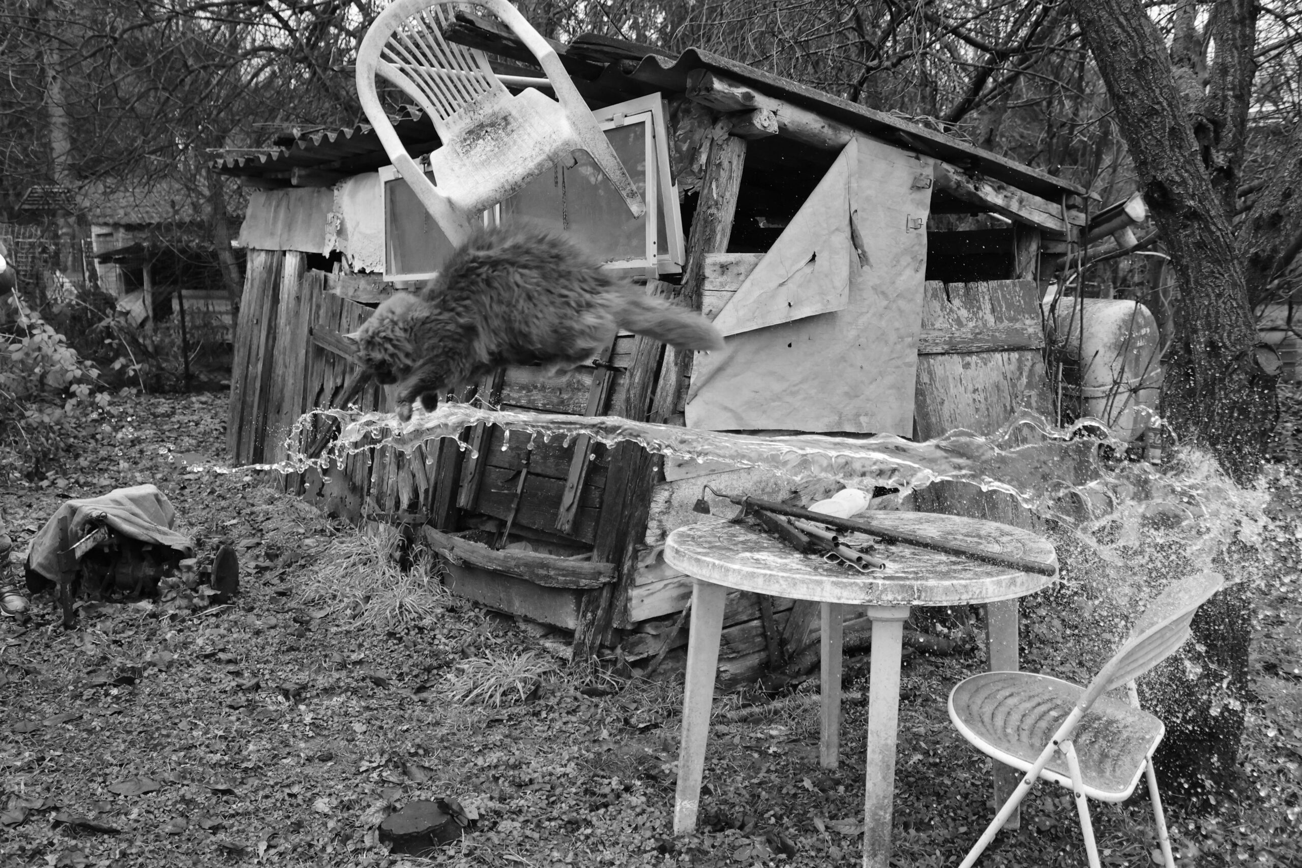 This series presents black and white digital photographs inspired by the photograph titled Dalí Atomicus (1948) by photographer Philippe Halsman. The images reference suspended motion, flying objects, and the presence of water as a rupture of reality. Like Halsman’s iconic photograph, each image captures a moment frozen in mid chaos. A chair flies through the air. A cat jumps. Water hangs suspended in space. However, instead of a surrealist studio, the scenes unfold in ordinary Hungarian domestic spaces. These include some rural gardens, courtyards, and backyards.