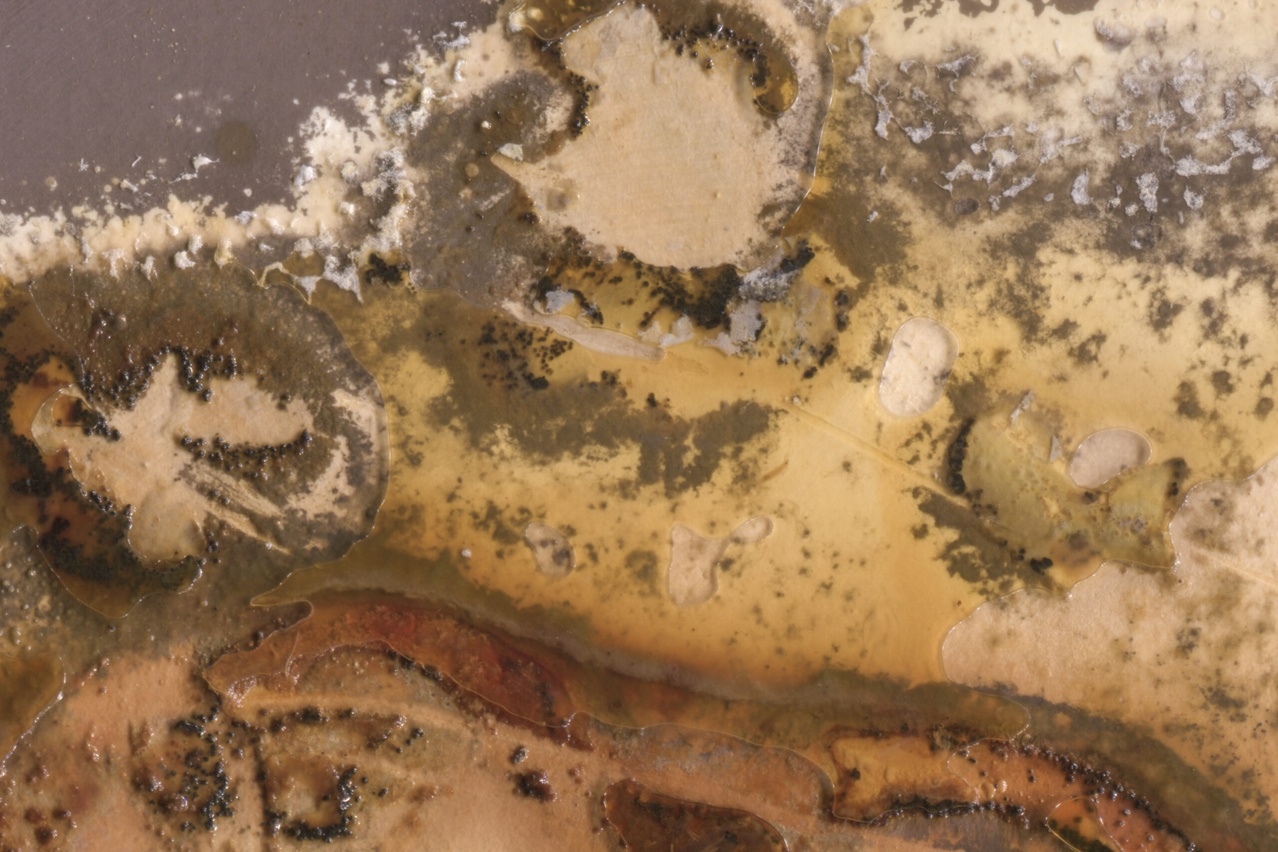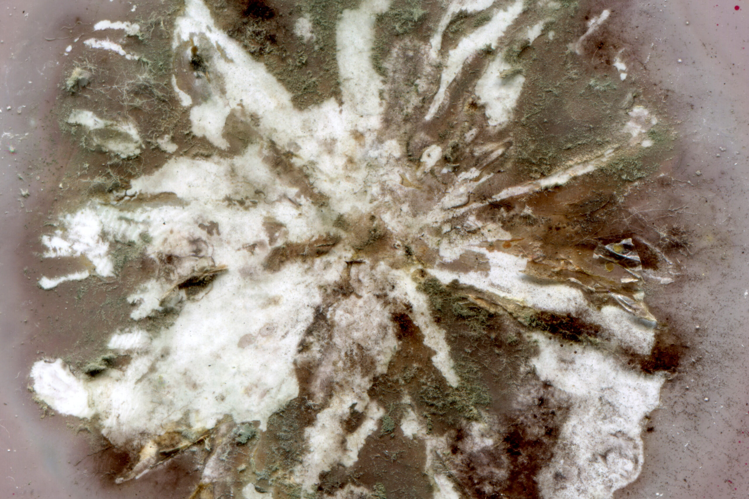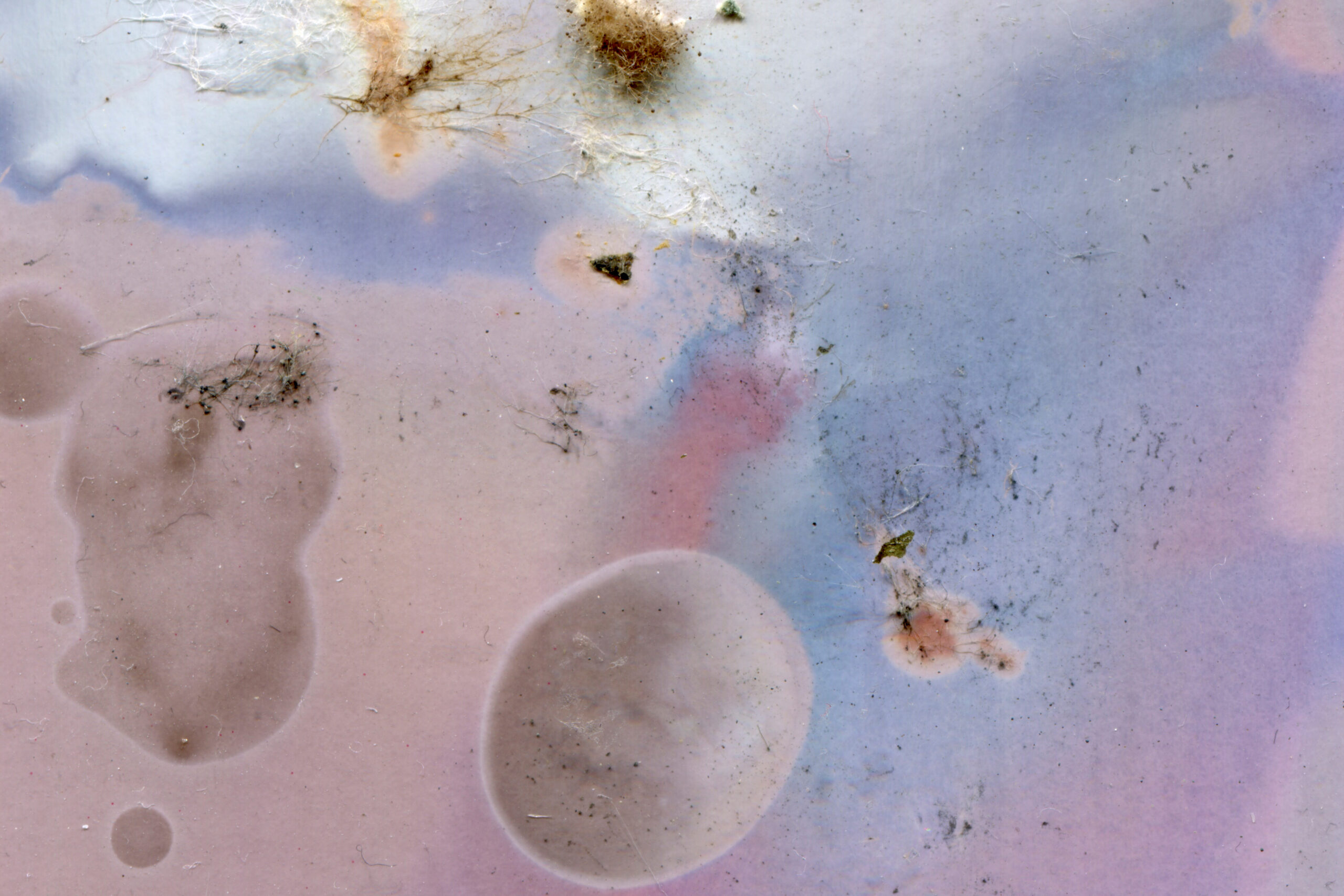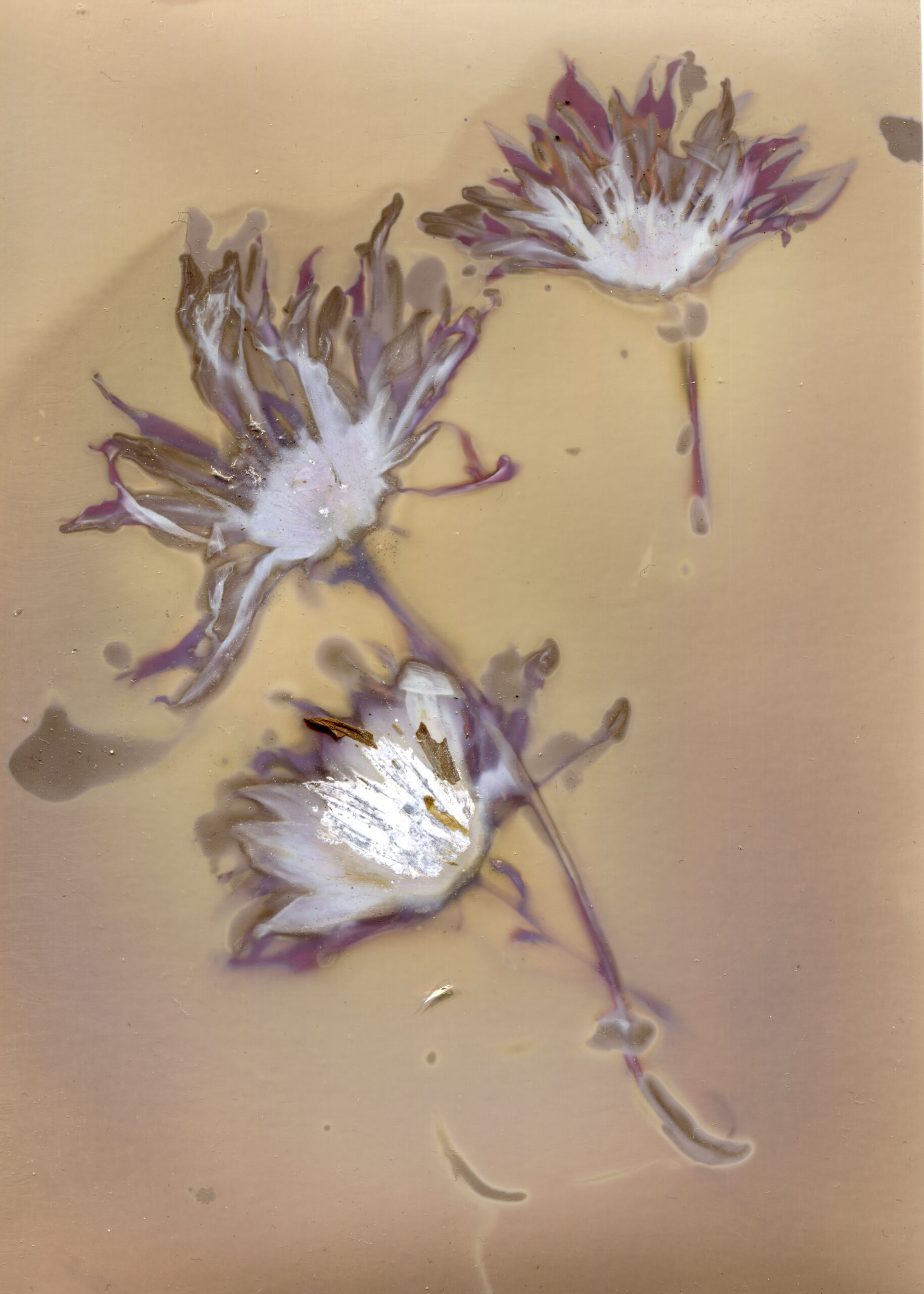 During the exposure, the paper gradually changed colour depending on the intensity and spectrum of the light. Meanwhile chemicals from the decomposition of the plants interacted with the surface. The process is completely unpredictable.